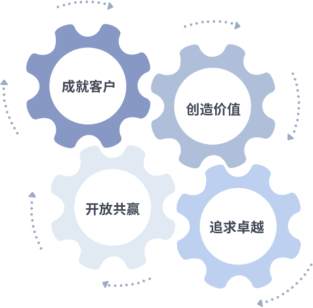 成就客户是一切决策的出发点,,,,创造价值是衡量所有工作的标准,,追求卓越是我们做事做人的态度,,,,开放共赢是我们的格局也是最终的结果。。。价值观的齿轮环环相扣,,推动着组织里的每个人不断向前。。。。